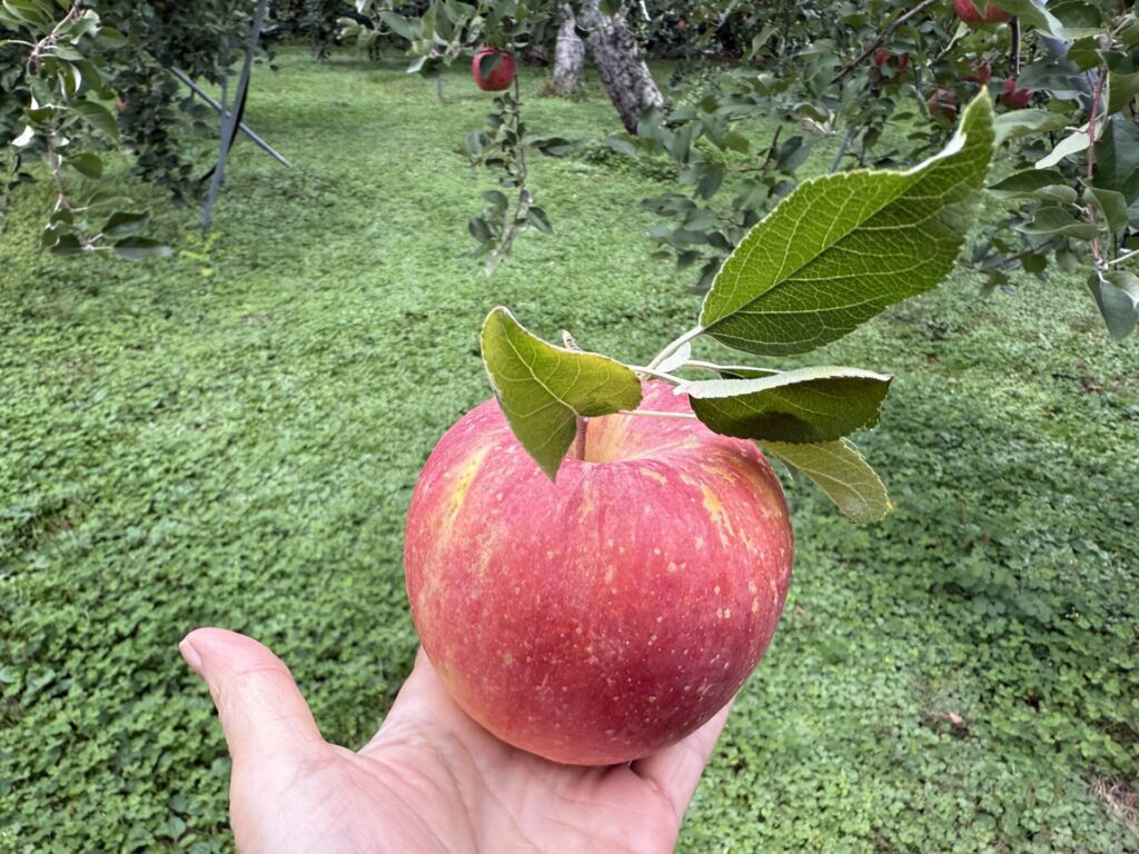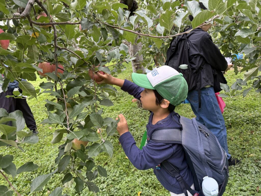 豪雪地帯でネオニコフリーに取り組むりんご栽培の話を聞いて、大切に育てられたりんごの実を収穫。植樹したりんごの苗の生育の難しさも教えていただきました。
