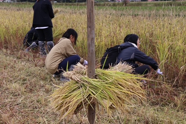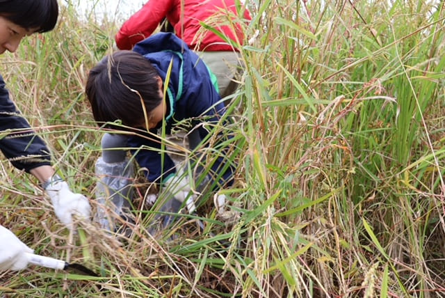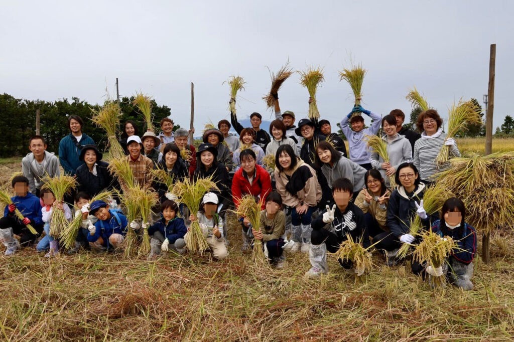 岩木山と八甲田山に囲まれた有機の田んぼで稲刈り体験をしました。