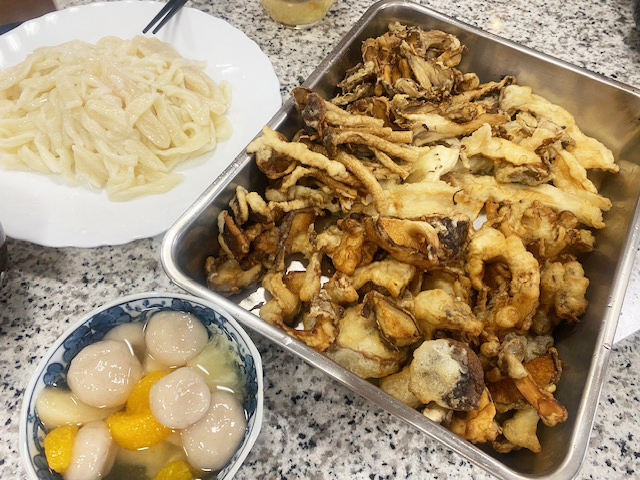 この日のメニューは、椎茸が苦手な子どももついつい食べてしまう「きのこの天ざるうどん」と「フルーツポンチ」。手打ちうどんや白玉に椎茸の粉が練り込まれた椎茸づくしのメニューです。子どもたちが何度も踏んだうどんはしっかりとはコシがあり、白玉はシロップになじんで大好評でした。