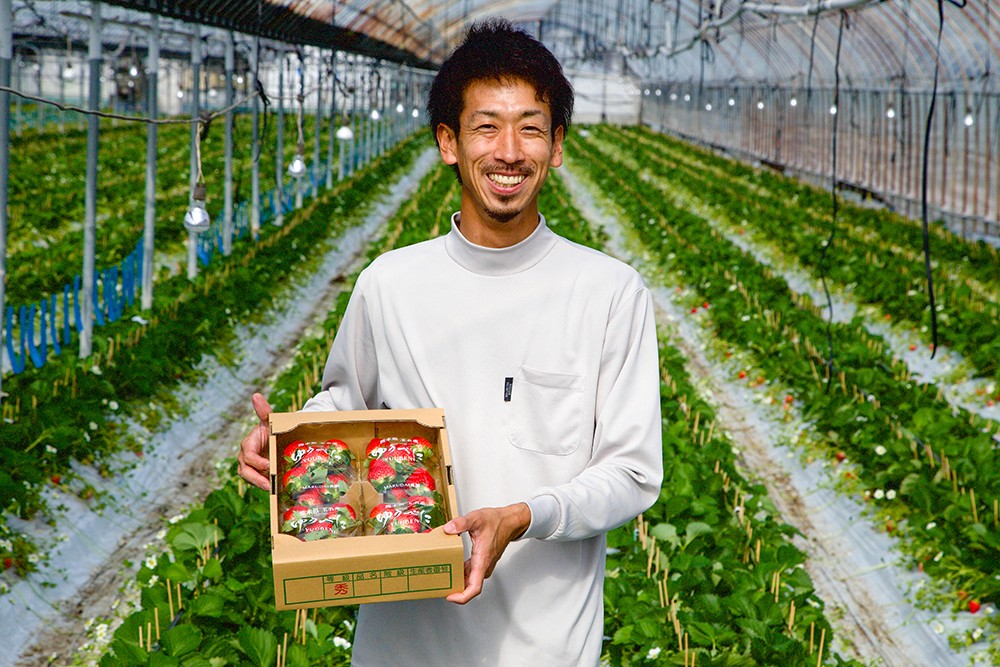 土耕栽培でいちごを栽培している大保幸弘さん。高床式の栽培に比べ「根がしっかり張って、味の濃いおいしいいちごが育つ」といいます。ミツバチが飛び回るハウスでは、できるだけ農薬を使わないために天敵昆虫も導入。2025年九州豪雨災害では、洪水でいちごの苗が水に浸かる被害があり、コープ自然派組合員から寄せられた義援金を届けました。