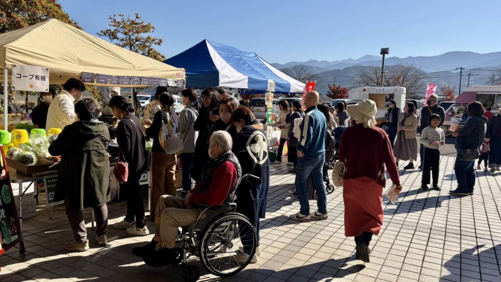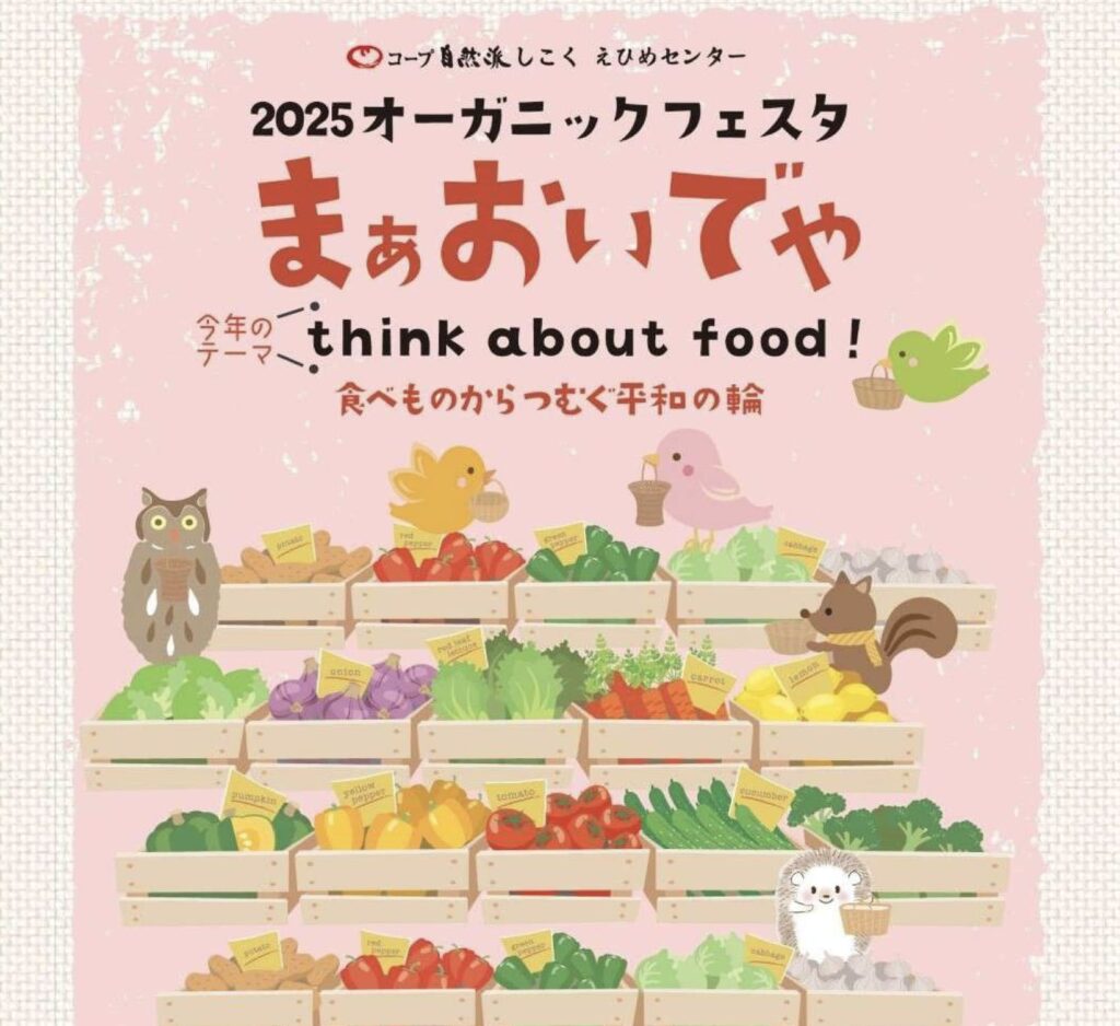 2025年11月30日、コープ自然派しこく(えひめセンター)では、西条市丹原文化会館を貸し切ってオーガニックフェスタを開催。生産者によるおいしい食べものや映画上映、楽しいワークショップもあり、子どもから大人まで笑顔いっぱい、お腹いっぱい、買い物も両手いっぱいになった1日でした。