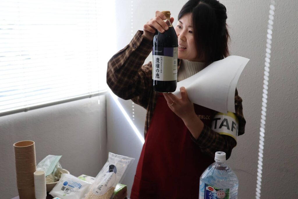 宇都宮章子さんによる麹ワークショップでは、チャック付き袋で塩麹と醤油麹をつくりました。持ち帰って、毎日袋を開けて空気を送って袋を揉んで、1週間ほどで完成します。宇都宮さんは「麹は生きもの。途中で水分が足りなかったら水や醤油を足して育ててください」と話します。早く発酵させたい場合は、炊飯器の保温機能を使って、60℃の湯に8時間ほどつけておく方法も紹介されました。