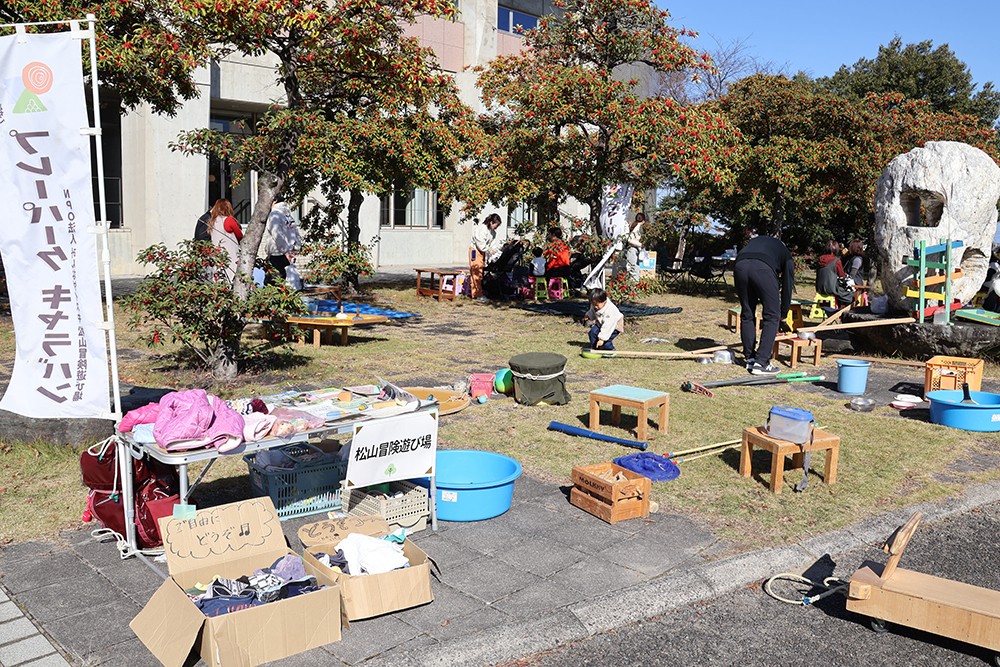 会場入り口にはコープ自然派の野菜やパンのブースが並んでいます。「自然派Style自然豚」や面河川(おもごがわ)の天然鮎が炭火で焼かれ、滴る脂とともに食欲をそそる香りが広がります。腸活スープや揚げがんも、おむすびなど地元のショップも並び、芝生広場は食事や遊びを楽しめる空間に早変わりしました。